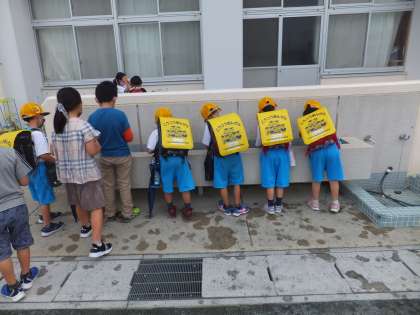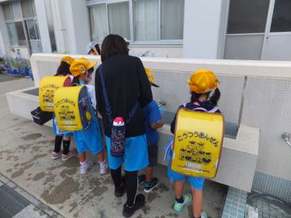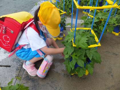 1年生がアサガオに水やりをしています。6年生も声かけをして手伝っています。