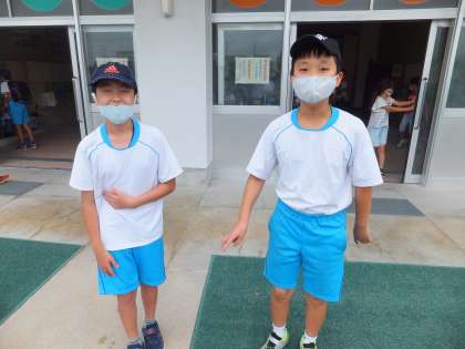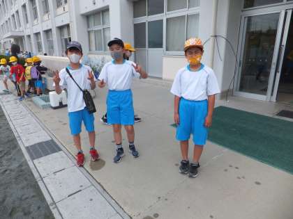 今日の挨拶ボランティアの様子です。東昇降口では、6年生と1年生や3年生が一緒に挨拶をしています。