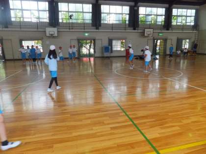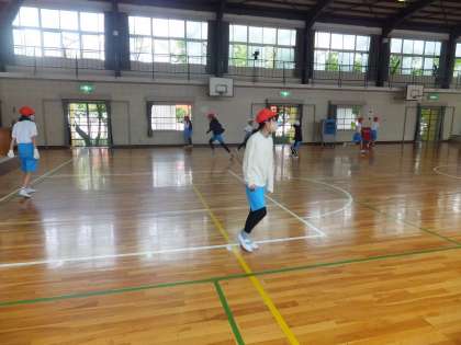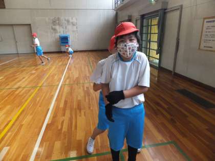1時間目の体育の授業です。2時間目にわくわく遊びがあり、その準備を1時間目の途中から行うため、十分な時間が確保できないので、今日は、手袋をはめて体慣らしのおにごっこを行いました。