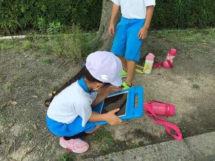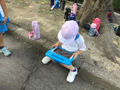 鉄棒遊びの学習の様子です。iPadで動画を撮影して、自分の技を確認しました。逆上がりができるためのポイントの1つである、「鉄棒とおへそとの距離」を動画でチェックしながら運動しました。