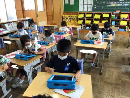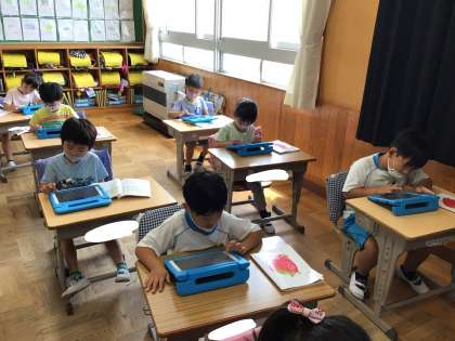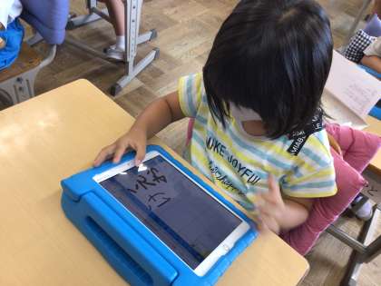 ひらがなの学習をiPadで行っています。全てのひらがなを覚えたかを確かめるために、発表ノートにペン書きできるかチャレンジしています。