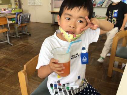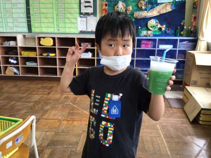 「カラフルいろみず」の学習をしました。絵の具を入れて、思いっきり混ぜました。「シェイクシェイク」と言いながら、ペットボトルを振りました。おいしそうなジュースが完成しました。