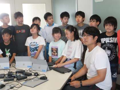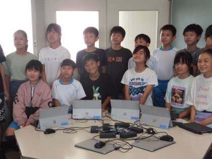 プログラミングクラブの卒業アルバム用の写真撮影の様子です。