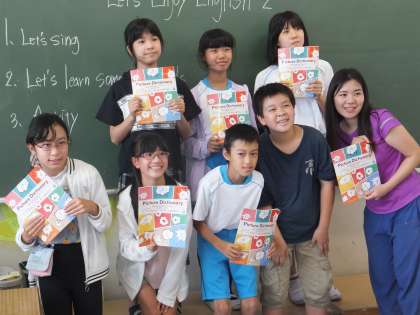 英会話クラブの卒業アルバム用の写真撮影の様子です。