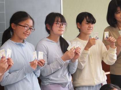 百人一首クラブの卒業アルバム用写真撮影の様子です。