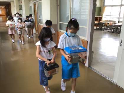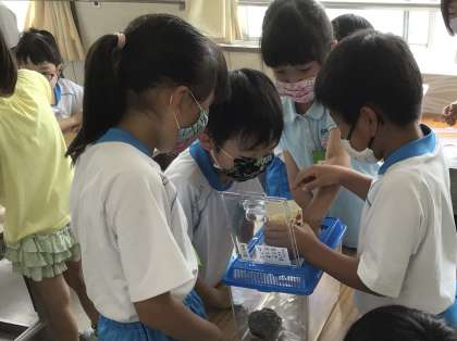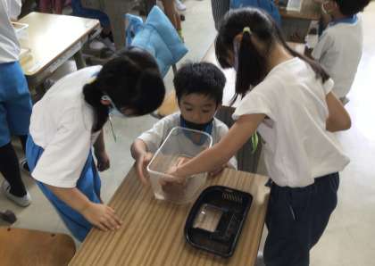 1年生に頼まれて、ザリガニを見せに行きました。