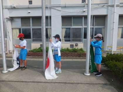 本日の5年生ボランティアの様子です。旗掲げや、挨拶、清掃ボランティアをしています。