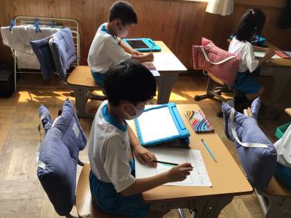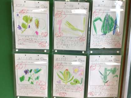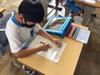 あさがおのつぼみを観察しています。目で見て、手で触り、鼻でにおいを嗅ぎ、iPad写真に撮って拡大して、つぼみをの細部まで詳しく観察しました。