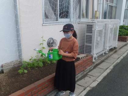 ツルレイシに水やりをしている4年生です。水やりだけでなく、挨拶ボランティアもしている4年生です。