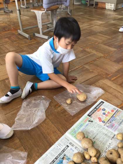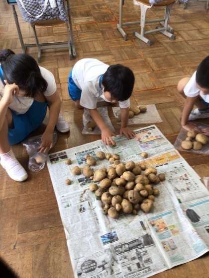 地域でお世話になっている方の畑で、ジャガイモがたくさん収穫できました。大きい 小さいや、いくつずつ分けるとみんな同じ数になるかなど、算数の学習をしながらみんなで上手に分けることができました。おうちでおいしく食べてください。
