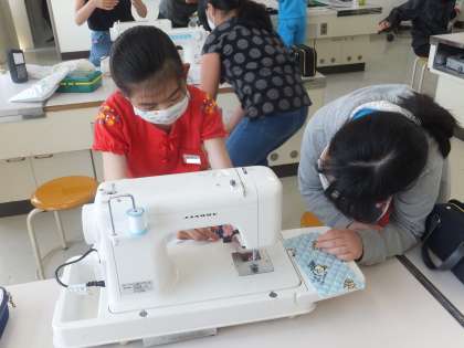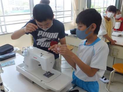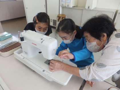 今日も、ミシンボランティアさんに協力していただきました。ミシンの準備をしているところです。初めてミシンを使う子もいるようです。