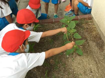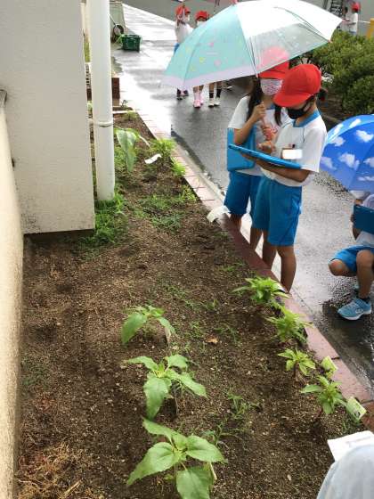 ヒマワリとホウセンカの観察をしました。当然の雨で一時避難しましたが、小降りになったところで傘をさして協力し、タブレットでの撮影も行いました。