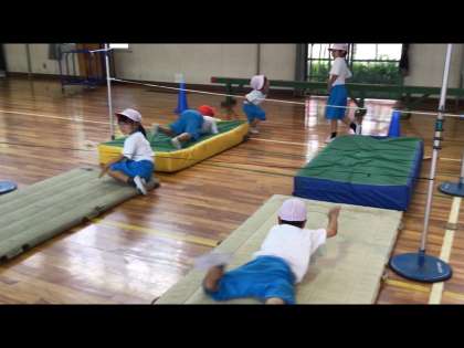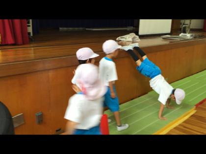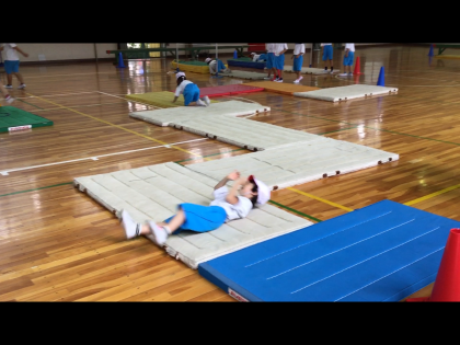 「マット遊び」の学習の様子です。遊びの中で、逆さ感覚や腕に体重を乗せる感覚などを身に付けていきます。