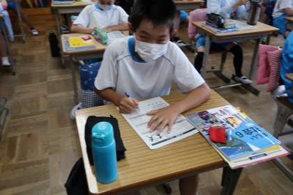 今日は、50mリレーの練習を行いました。途中で大雨になり、昇降口に避難しました。振り返りカードも書きました。