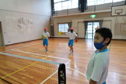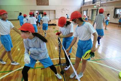 体育の授業でテニピンをしました。まずは、換気や熱中症対策のために体育館の窓をすべて開けました。次にネットを張って準備をしました。