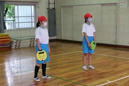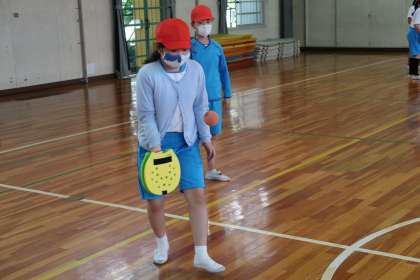 体育の授業では、体育館が利用できるときにテニピンを行っています。手袋をしてからグローブをはめています。