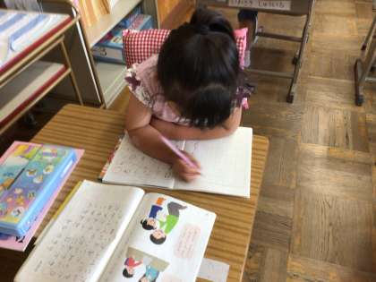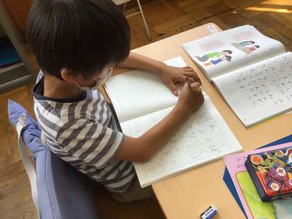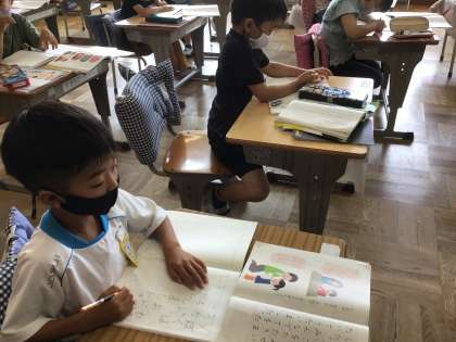 「こんなことしたよ」の学習で、文を書いています。学校でしたことを伝える文を、考えています。