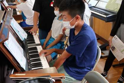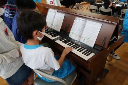 今日の音楽の授業です。前半は、色々な楽器を演奏しました。木琴の心地よい音色が聞こえてきました。