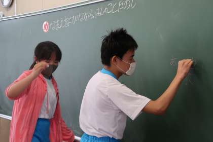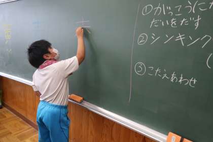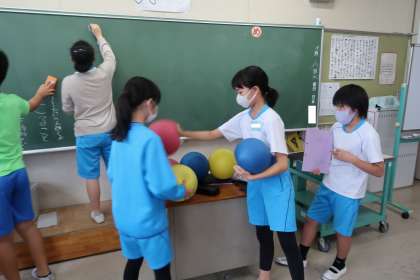 わくわく遊びの準備をしているところです。黒板に必要事項を書いたり、使用する道具を準備したりしています。