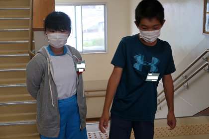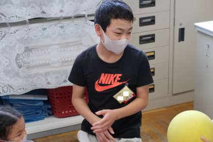 42班のわくわく遊びの様子です。円になって座り、大きなボールを隣の子に渡していきながら遊んでいました。歓声が聞こえてきました。