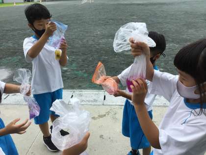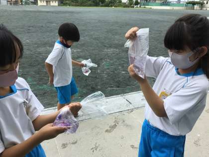あさがおの花から、どんな色がでてくるかな?みんなで、もみもみしています。