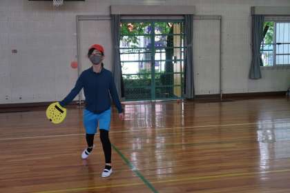 体育の授業です。今日はテニピンのゲームをしました。1試合目です。