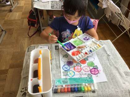 パレットを手で持って、色を作っているよ!あさがおが、とってもきれいだね。