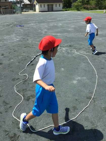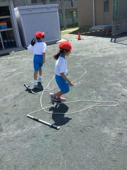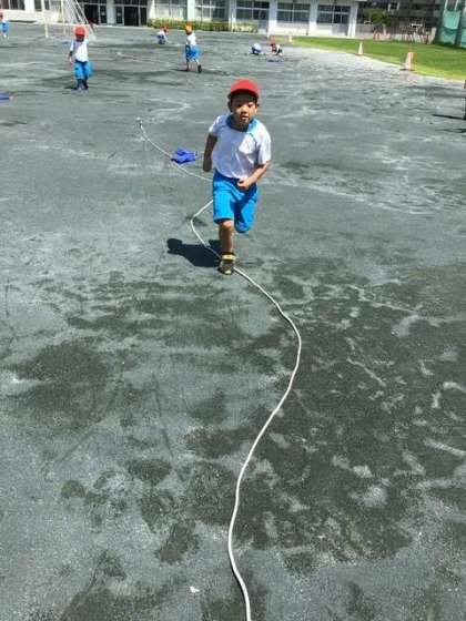 今日は、だんだん気温が上がってきていたので、15分という短い時間で体育を行いました。長縄を使って、自分たちの走るコースを作りました。ぐねぐね道やジクザグ道などいろいろなコースを試していました。