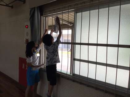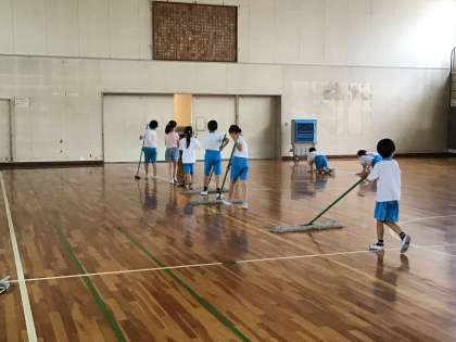 体育館掃除は5年生と一緒に行っています。5年生のお兄さんお姉さんに教えてもらいながら頑張っています。