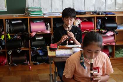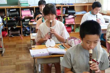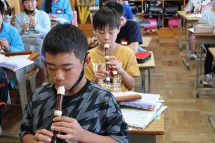 音楽の授業では、リコーダーを演奏しています。曲名は、「星空はいつも」です。どの子も上手に演奏しています。