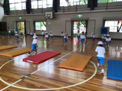 「マット遊び」のウォームアップの様子です。マット遊びの動きに繋がるような運動に取り組んでいます。