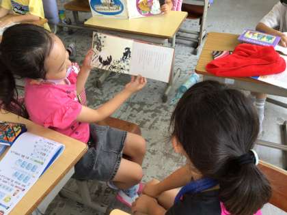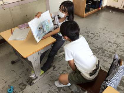 気に入った本を選び、読み聞かせをして、おもしろいところを友達に伝えています。