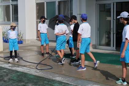 今日の挨拶ボランティアの様子です。暑くなっても頑張っています。ホースで水を撒いています。