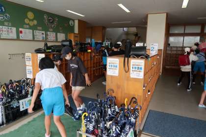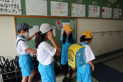 挨拶ボランティアを終えた後、教室に行く様子です。どの子も達成感に満ちた素敵な表情で教室に入っていきます。