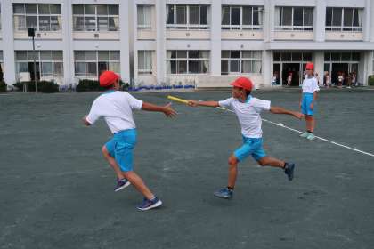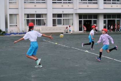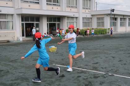 1組の体育の様子です。この時間に雨が降ることが多く、久しぶりに50mリレーを行いました。みんな笑顔で走っていました。この授業後に大雨が降ってきました。