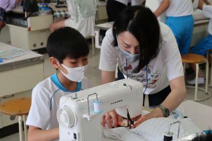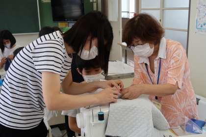 家庭科の授業です。今日もミシンボランティアさんに協力していただきました。今までありがとうございました。
