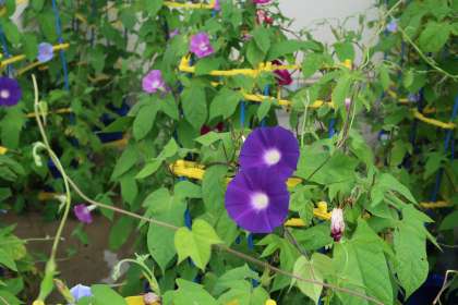 昨日の挨拶ボランティアの様子です。挨拶している6年生の横には、1年生が育てているアサガオの花が咲いています。