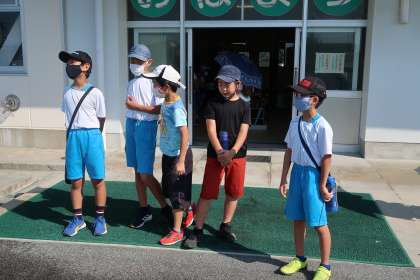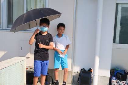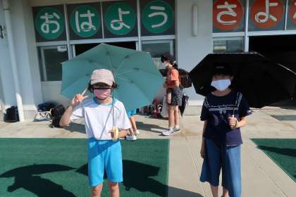 5年生の挨拶ボランティアの様子です。暑い中、元気よく挨拶を頑張っています。