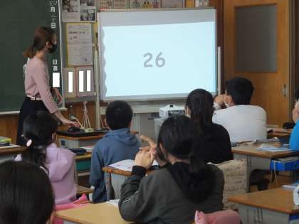 4月20日の英語の授業の様子です。ホワイトボードに映し出された数字を英語で読みました。また、英語を使って、話し合い活動を行いました。