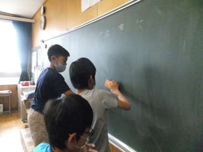同じ日です。黒板に書かれた文字を丁寧に消してくれています。また、1年生に大人気の6年生もいます。
