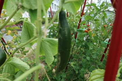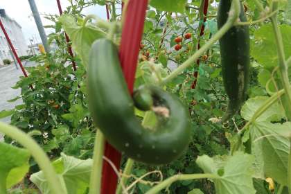 なかよしさんで育てているキュウリです。大きいキュウリが実っていました。