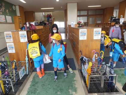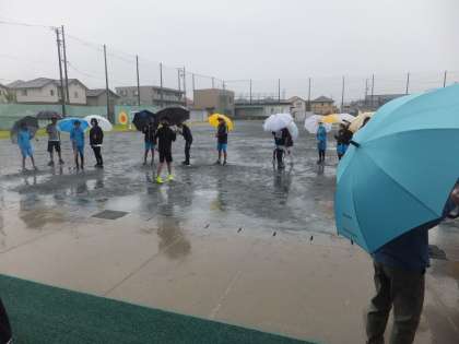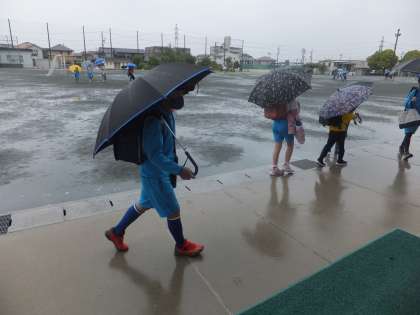 5月27日の朝の様子です。この日の朝は、雨天だったようです。傘を持ちながら挨拶ボランティアをしていました。