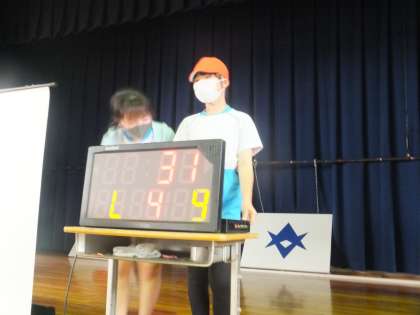 次は、シャトルランです。次のブザーが鳴る前に、ラインに触れないといけません。徐々にそのブザーの間隔が短くなってきます。とても疲れる種目です。