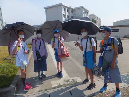 6月7日の下校の様子です。日傘を使う6年生が増えてきた時期です。6年生も仲良く下校しています。