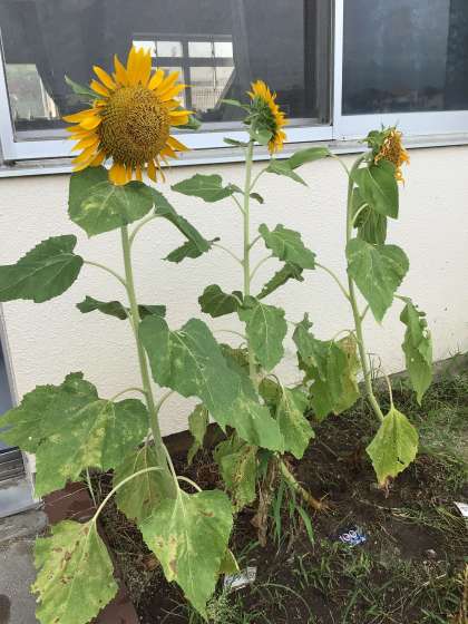 3年生の皆さんお元気ですか?学年園のヒマワリが美しい花を咲かせました!