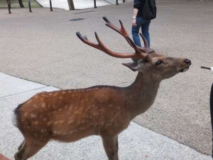 シカが狙っているのは、ある先生が手に持っていたパンフレットです。後ろから静かに近づいています。この後、パンフレットにかみつきました。