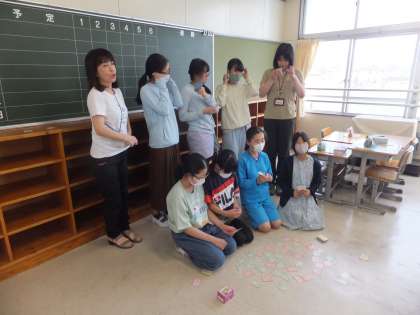 百人一首クラブは、少人数の班ごとに分かれて行っていました。写真を撮る直前にマスクを外し、無言で笑顔になって撮影していました。撮影が終わった後はすぐにマスクをつけていました。