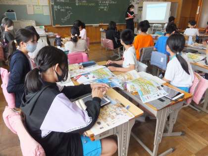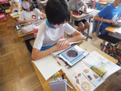 社会の授業です。学習用タブレットで調べ学習をしたり、グループ活動をしたりして考えを深めていました。