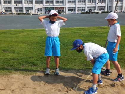 5年生が朝にお手伝いをしていました。体力テストの準備です。砂場の土を掘り起こしています。