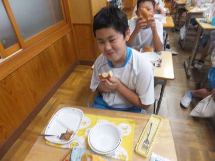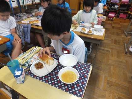 給食の様子です。全員無言で前を向いて食べていました。この日のメニューは、ロールパン、鶏のから揚げ、スープ、ご飯、牛乳でした。